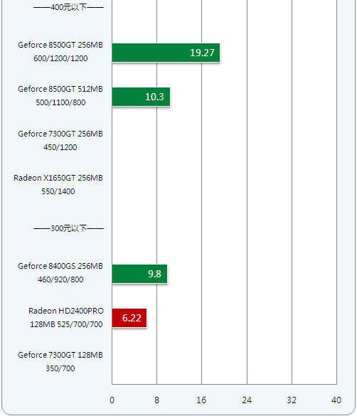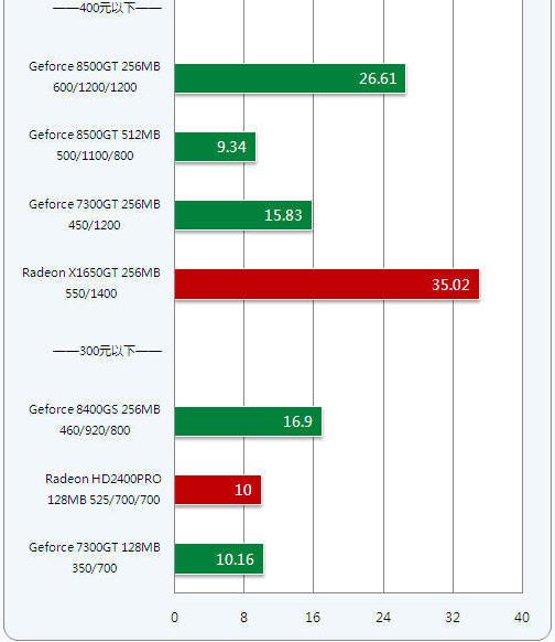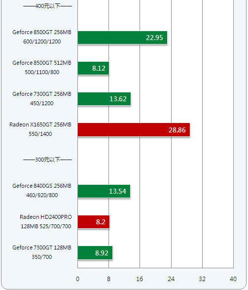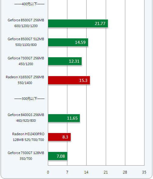 400元内价位的显卡Radeon X1650GT、Geforce 8500GT和GeForce 7300GT,相比300元内价位的显卡虽然贵100元,但性能提升接近一倍,达到一定的游戏性能。比如玩一些竞技游戏和主流3D网络游戏还是比较轻松的,如果你愿意牺牲一点画质还可以流畅运行主流的大型3D游戏。