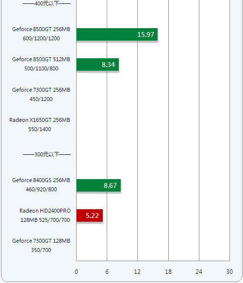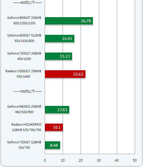 通过柱状图可以看到,499元价位的DX10显卡在新一代游戏中发挥出强大的性能,Radeon X1650GT也略显优势。而400元以下的显卡,不是硬件规格太低,就是架构太老,无法以流畅的速度运行游戏。