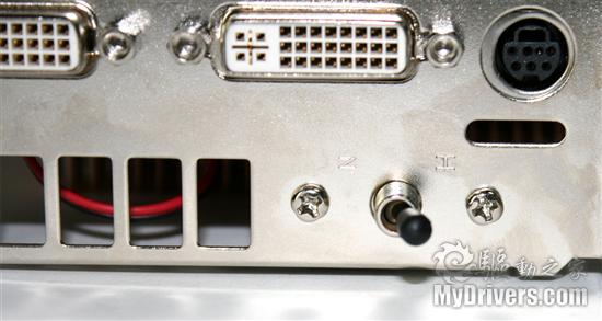显卡挡板上的拨动开关具有“H”(高频率)和“N”(正常频率)两个档位。拨动开关通过一条黑线连接在显卡的一个跳线上,其变频原理很简单:频率信息是写在显卡BIOS中的,而这款显卡具备两个BIOS,用户可以通过这个开关来选择对应的启动BIOS,进而改变显卡的运行频率。因此这个开关要在开机前就调节好才会有用。这跟其它某些显卡的“一键超频”特色功能并没有什么两样。
