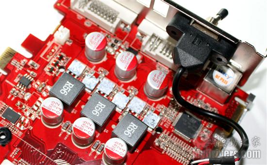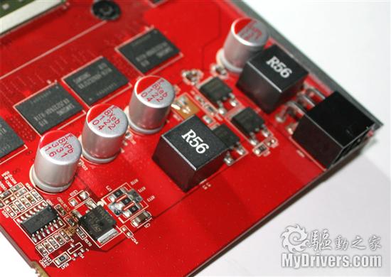 这款显卡采用的是3+2相供电设计,3相核心供电电路位于显卡的前端,每相电路都具备3个MOS管,以增大各相电路的电流容量,从元器件整齐的排布上我们可以轻易地解读出每一相供电电路的构造。供电电路在用料上采用的是富士通全固态电容和R56铁素体电感,这有助于提高显卡的运行稳定性和使用寿命,另外3相供电电路也已经能够满足RV770显示核心的用电需求了。由于以DVI输出方式为主,且ATI显卡的RAMDAC电路集成在GPU芯片内部了,因此这款显卡在模拟信号的低通滤波电路方面并没有花费太多功夫,对消费显卡来说这也已经足够了。