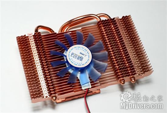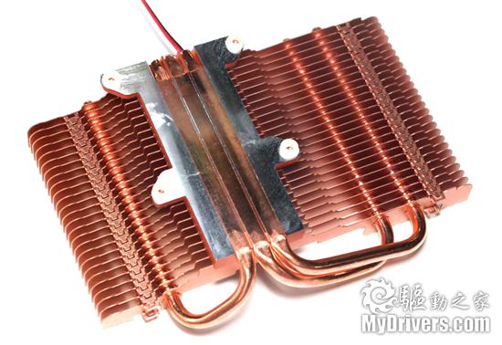 散热器的吸热底座体积很大,由一整块金属铜切割而来。其硕大的身躯也便于其吸收、存储热量。三条热导管的底部在这里变得平整,可以直接与GPU表面贴合,能够迅速将GPU产生的热量传导到散热片上。这一点处理得非常专业、高效。
