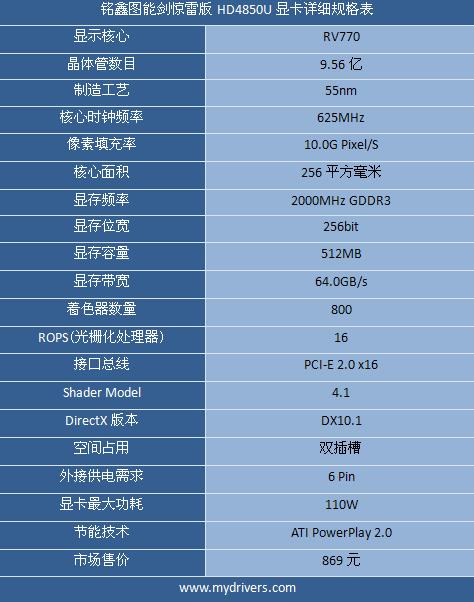 铭鑫图能剑惊雷版HD4850U显卡详细规格表