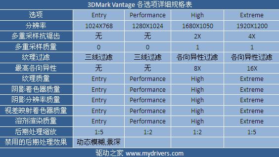 3DMark Vantage四套预设模式的详细设置参数