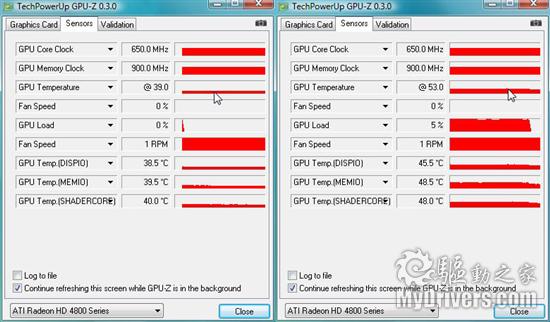 整个测试过程中这款铭鑫4850U显卡核心温度并不高,待机温度在39°C左右,远低于公版4580显卡的核心温度。满载状况下,其核心温度大概是53°C(室温20°C,开放式裸奔环境),显卡温度控制比较让人放心,这套3热管爱琴海散热器功不可没。