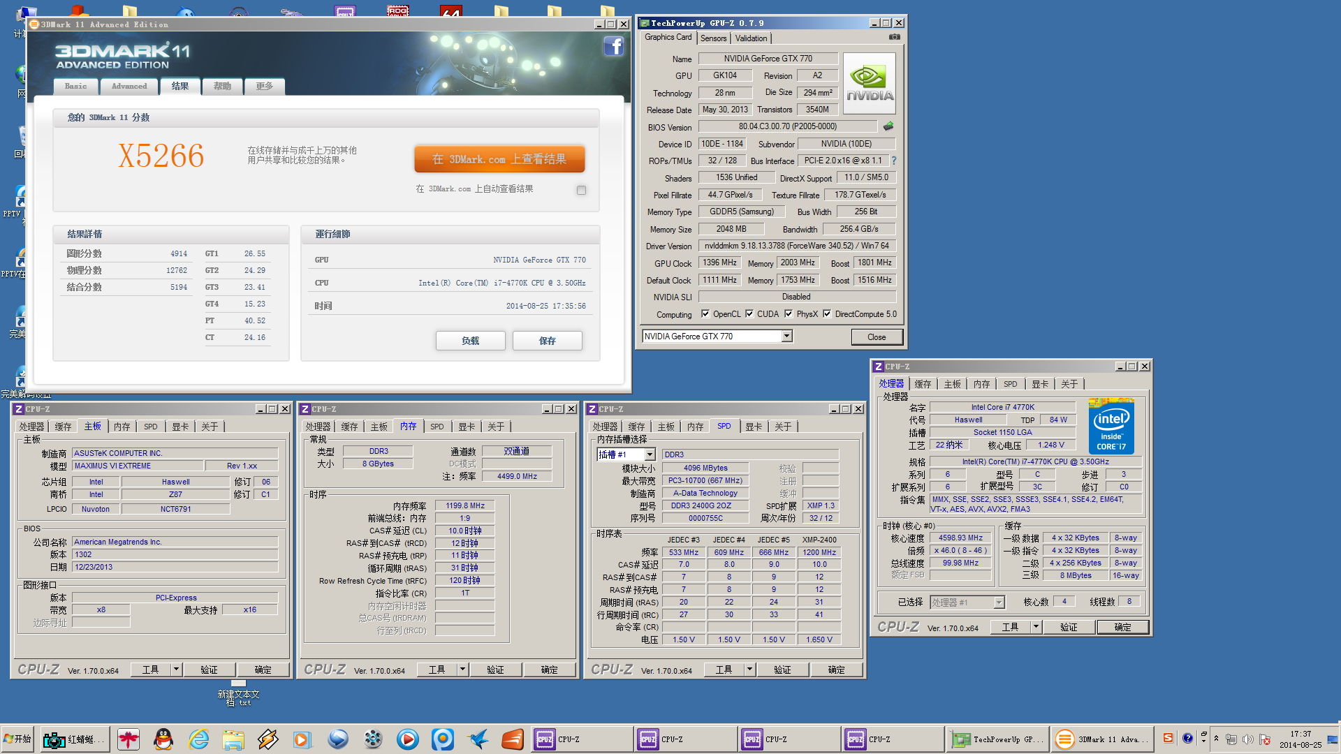1、3DMark11测试Extreme模式得分X5266,验证链接: http://www.3dmark.com/3dm11/8649179