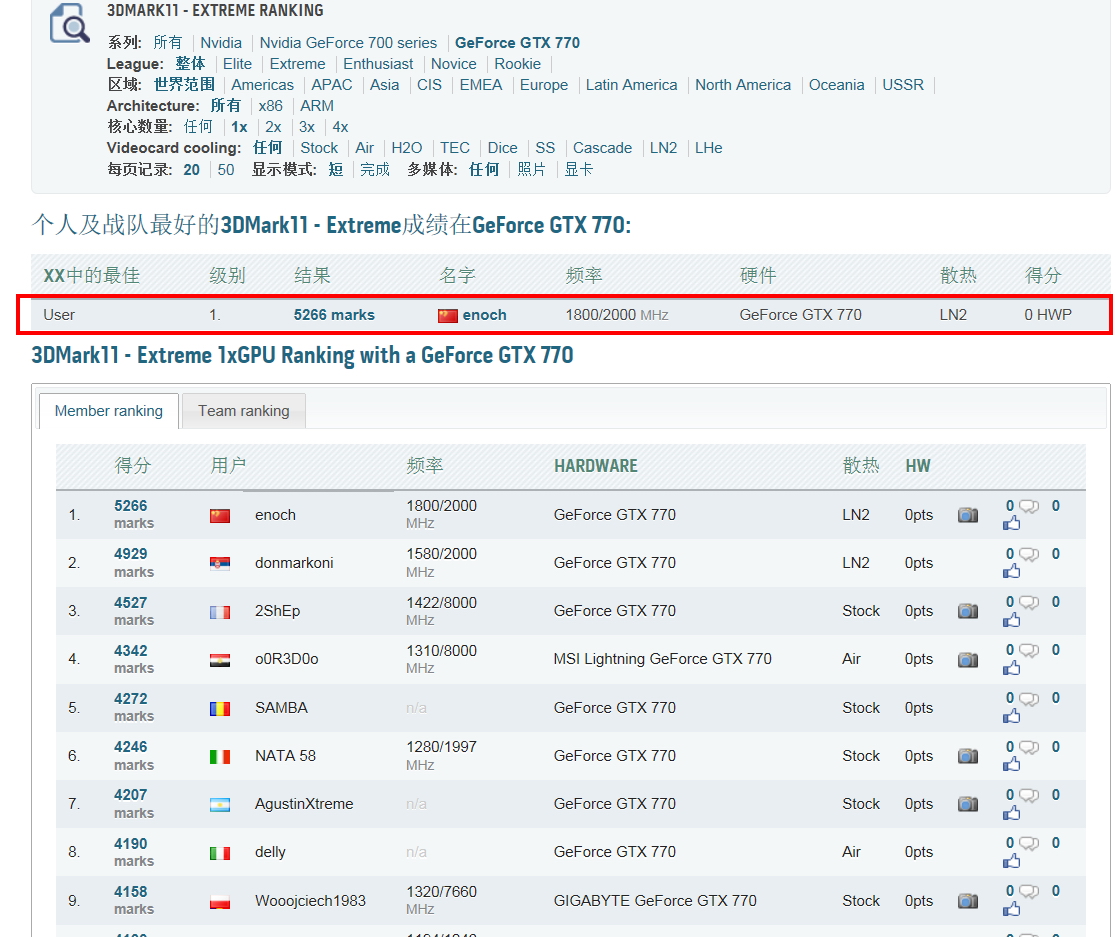 GTX770显卡虽然上市已经有一段时间了,但是凭借其强劲的性能依然担当着NVIDIA中高端主力显卡的重任。铭鑫视界风GTX770U-2GBD5中国玩家版便是众多GTX 770显卡中的佼佼者。国内著名超频玩家Enoch近日就将铭鑫GTX 770中国玩家版显卡超频至1800/8000MHz的恐怖频率,再次刷新GTX 770频率的世界纪录,并拿下3DMark11测试Extreme模式得分世界第一的好成绩。