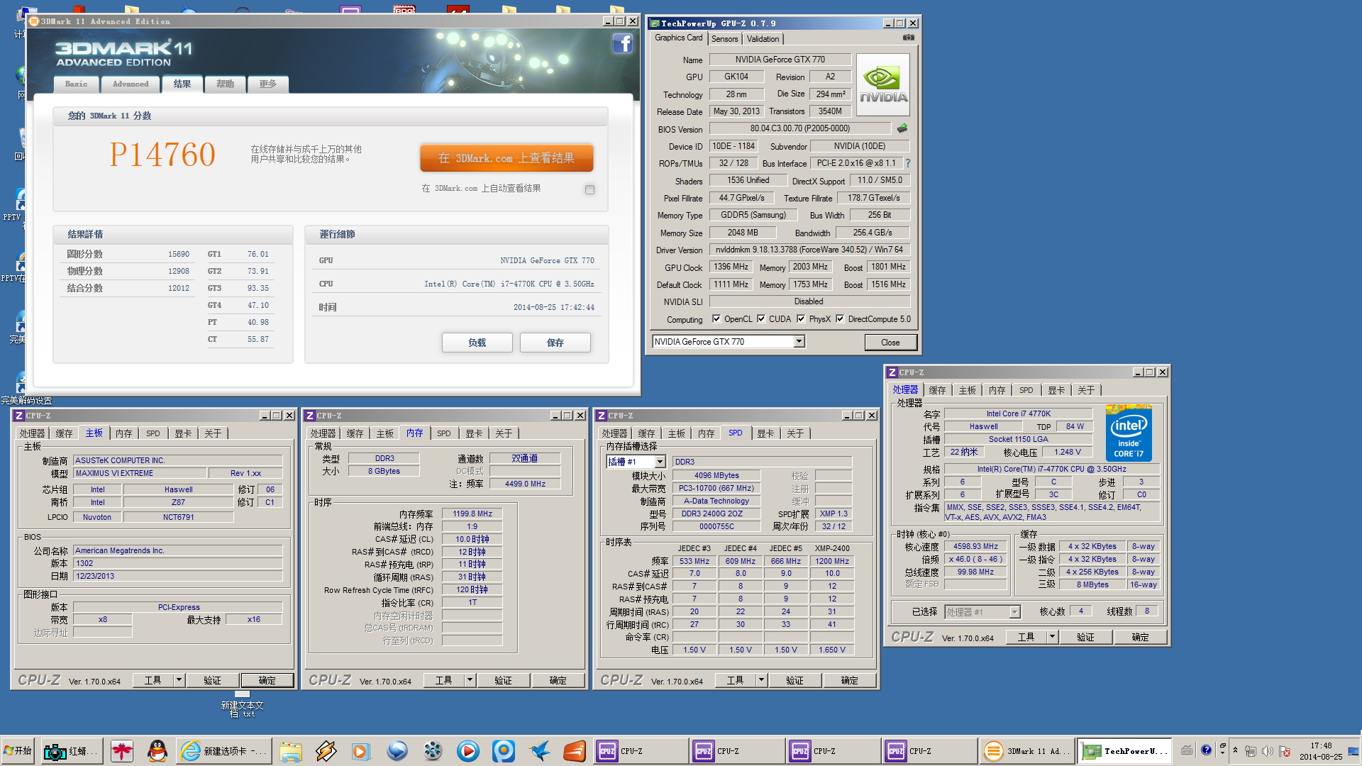 2、3DMark11测试Performance模式得分P14760,排名世界第二,验证链接: http://www.3dmark.com/3dm11/8649210