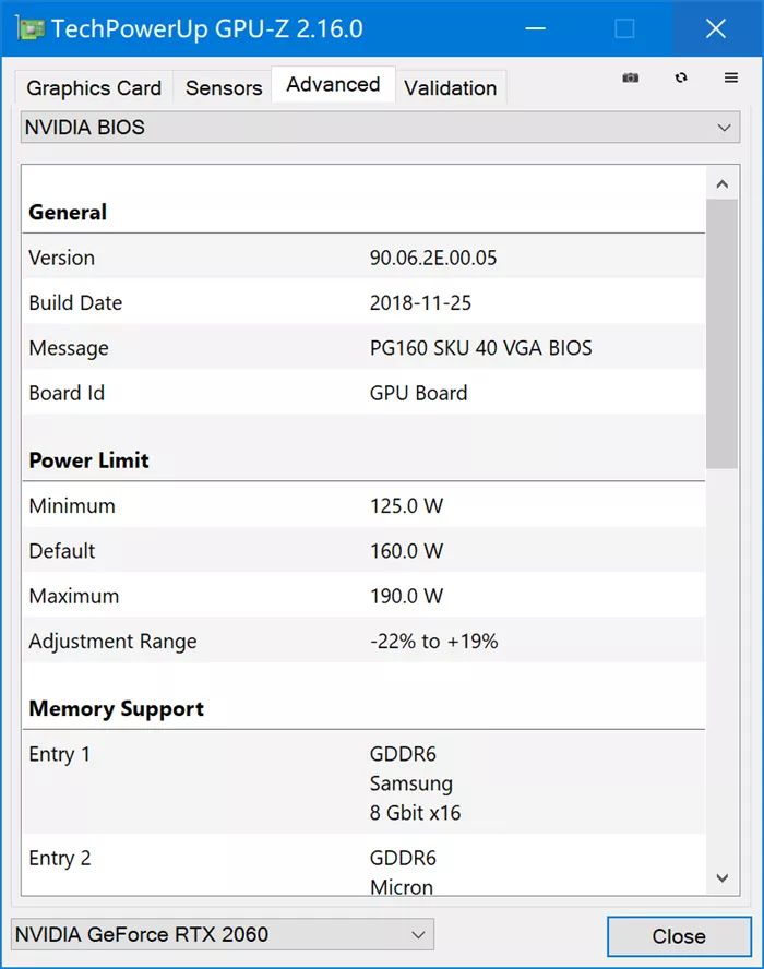 从GPU-Z上了解到的信息,RTX 2060 Founders Edition可能与RTX 2070 Founders Edition采用同样的PCB方案,即PG160公版方案,有待拆解验证。默认TDP为160W,可上浮19%,即190W。