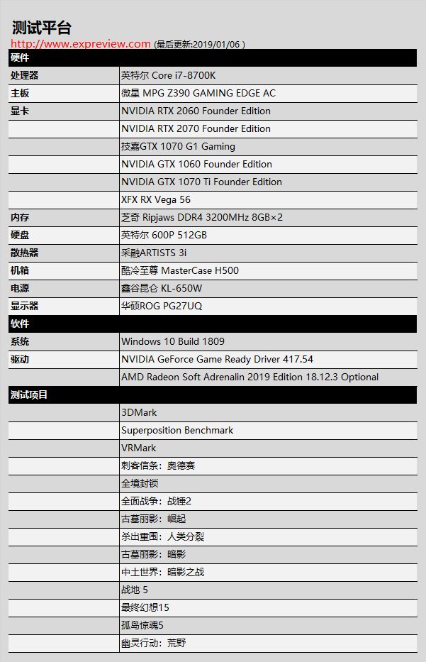 测试项目包括常规的3DMark(Fire Strike、Time Spy)、Unigine Superposition以外,也加入了VRMark测试。此外还有10款涵盖性能要求、游戏类型不同的游戏,游戏、设定与之前RTX 2080 Ti /2080/2070 Founders Edition有所不同,不可直接比较。游戏均采用最高画质设置,测试分辨率包括了1920×1080、2560×1440。