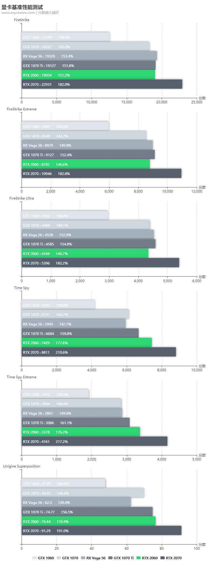 从3DMark成绩来看,RTX 2060对比GTX 1060来说,进步是相当明显,DirectX 11的FireStrike领先幅度在40-50%之间,DirectX 12 Time Spy更是达到惊人的77%。性能确实稳超GTX 1070,几乎达到GTX 1070 Ti的水平,与RTX 2070的差距也就在20%左右。继承了图灵显卡在DirectX 12下良好的性能表现传统,Unigine Superposition测试项目下也有优异的表现。