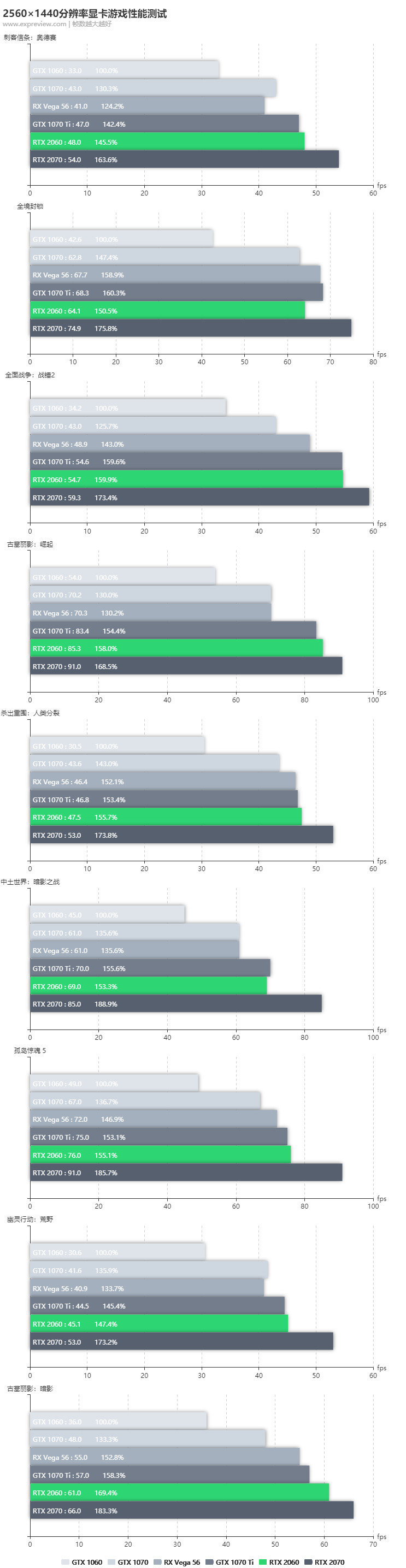 从我们测试结果来看,2K分辨率下,RTX 2060继承了Turing核心优良传统,分辨率越高,优势越明显,全部游戏表现都胜于GTX 1070 Ti,令人欣喜。虽然部分游戏达不到60fps“流畅”要求,我们可以适当降低一档、两档画质达到要求。