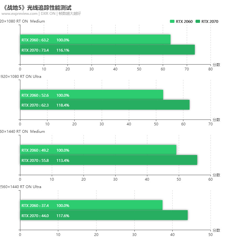 另一方面,RTX 2060的光线追踪性能也不必担心,《战地5》1080P、开启DXR 中可以60+fps帧数流畅运行,而在DXR 极致画质下也有52fps,这也足够你玩耍其他光追游戏了。DLSS也有焕发新生,不再局限于4K分辨率之下,RTX 2060也能享受到AI深度学习带来的“额外”性能提升。