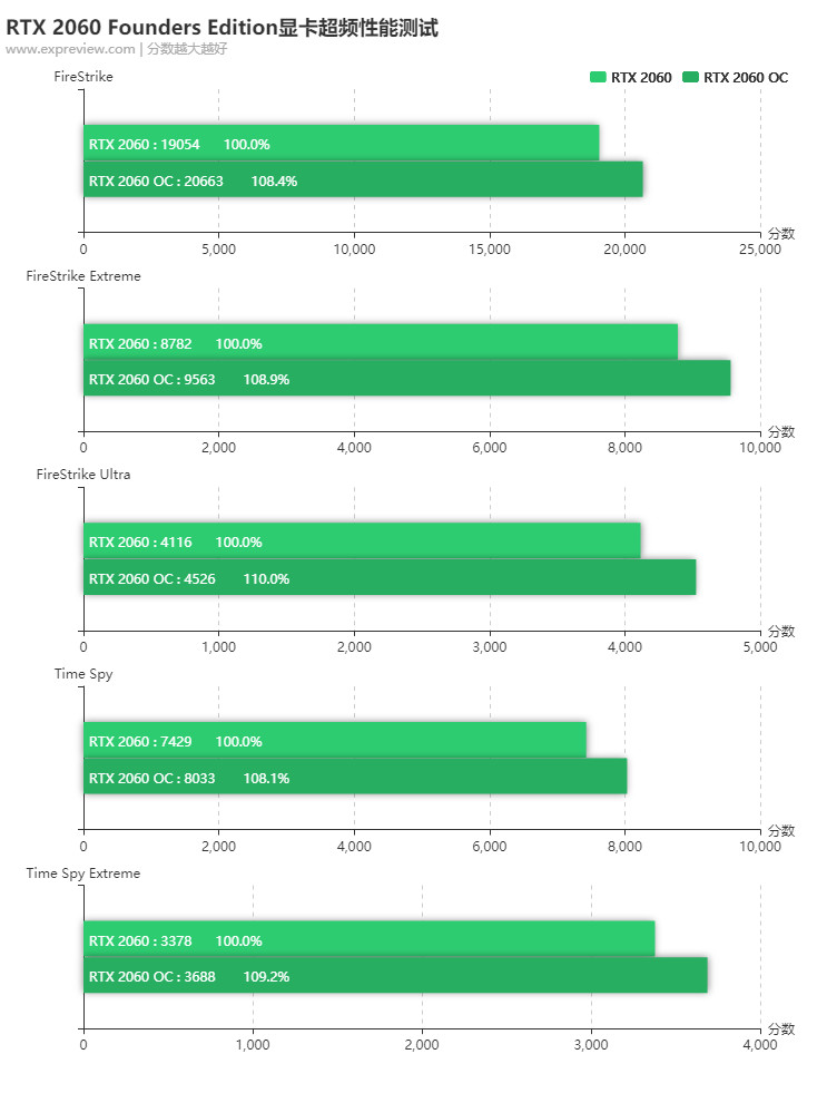 最终我们将手上这块RTX 2060 Founders Edition核心频率+130MHz、显存+1000MHz完成所有3DMark测试,超频后可以看到性能提升8-10%之间,跟之前的RTX显卡差不多。