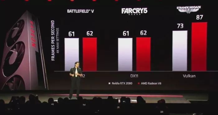 AMD表示,在同等功耗下其性能提升了25%,在《战地5》等游戏中Radeon VII将性能提升29%,支持Vulkan的游戏提升高达40%。