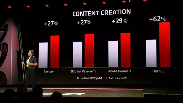 此外,AMD还表示Radeon VII显卡不仅是游戏显卡,也是一张创作者显卡。相比于RX Vega 64,Radeon VII显卡的图形、视频编辑性能也有着很大提高。