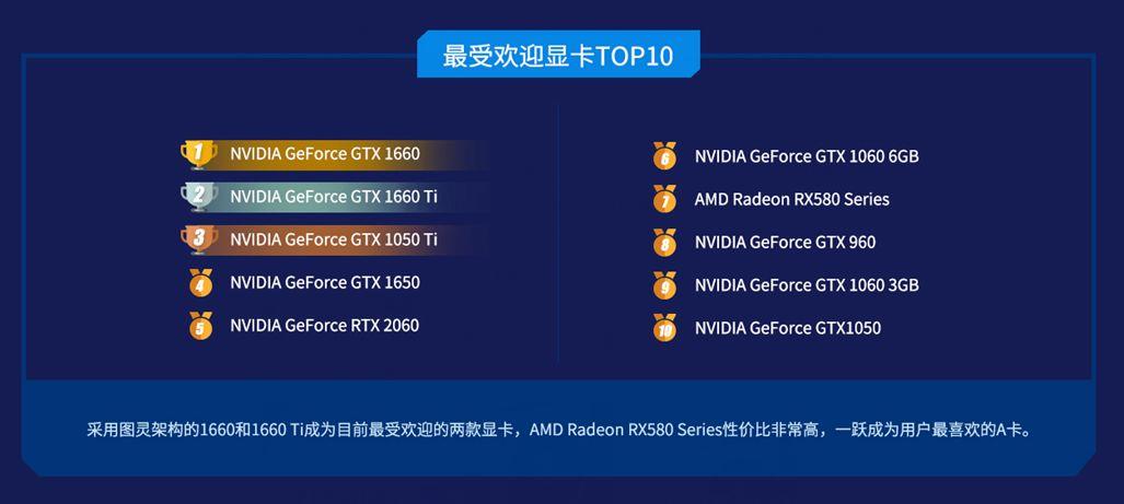 在最受欢迎显卡Top 10中,英伟达的GTX 1660排名第一,第二是GTX 1660 Ti,第三名是GTX 1050 Ti,AMD只有RX 580进入了前十名。